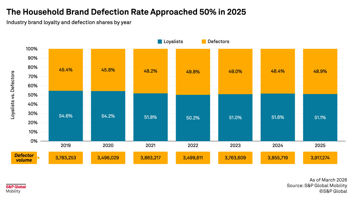 In 2025, almost four million households that acquired a new vehicle defected from the brand in the garage—that means nearly 50% of all households that return to market (RTM) are defecting, which is a jump of 4.7 percentage points above 2019’s pre-pandemic defection rate of 45.4%.
