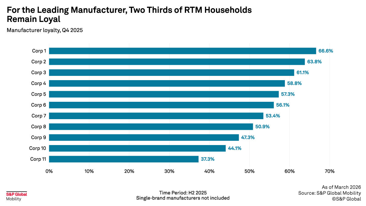 Manufacturer loyalty varies significantly across the 11 largest multi-brand manufacturers, from a high of 66.6% down to 37.3%. That is almost a two-to-one spread and represents vastly different conquest exposure and defensive requirements.