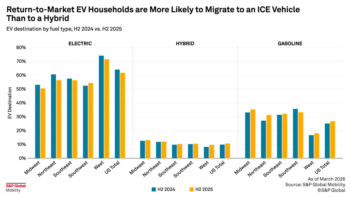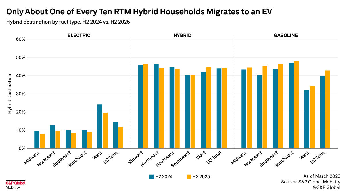 Hybrid owners nationally present a different dynamic, being more likely to acquire another hybrid or a gasoline vehicle than an EV. Still, in the West, hybrid-to-EV migration runs higher than average. Conquest campaigns targeting hybrid owners in Western markets can be structured around range, charging access, and payment comparisons that bridge from hybrid economics to EV ownership.