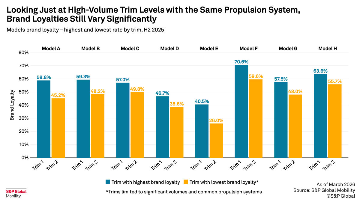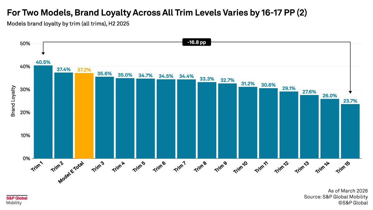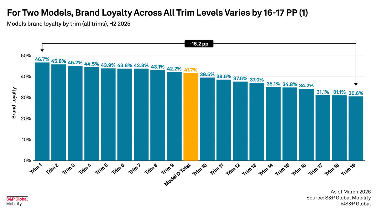 For a single compact crossover model with 18 to 19 trim configurations, brand loyalty can vary by nearly 16 percentage points from the highest-loyalty trim to the lowest. A comparable model shows a gap approaching 17 points.