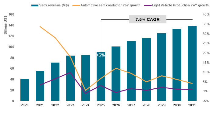 According to data compiled by S&P Global Mobility’s E/E & semiconductor service, global automotive semiconductor revenue is projected to grow from around $90 billion in 2025 to approximately $139 billion by 2031, representing a compound annual growth rate of 7.5% CAGR from 2025 to 2031. That growth far outpaces global vehicle production, which is expected to rise much more modestly over the same period. That growth far outpaces global vehicle production, which is expected to rise much more modestly over the same period.