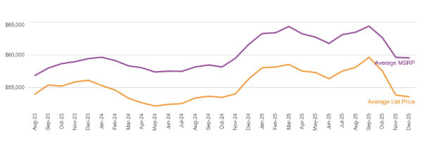 Perhaps most significantly, average EV list price has declined substantially from $59,599 in September to $53,577 in December, a trend driven by both incentives and fundamentally lower pricing on 2026 Model Year (MY26) models.