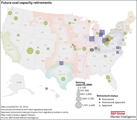 Another 22.9 GW of plant retirements have already been announced or received regulatory approval for 2019 to 2024, marking 71.6 GW retired or scheduled to be retired between 2014 and 2024. The analysis of federal data shows about 245.6 GW of current operating coal plant capacity in the US and does not include more recent retirement announcements from Entergy Corp. and a city-owned plant in Michigan.