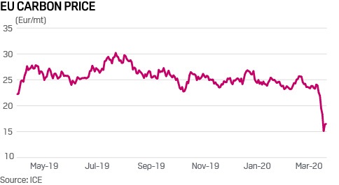 What’s happening? EU carbon allowance prices have fallen 30% since the start of March as the coronavirus pandemic took a heavy toll on generating fuels, power generation demand and the general economic outlook. EU Allowance futures for December 2020 on the ICE Futures Europe exchange fell below Eur16/mt ($16.89/mt) for the first time in 20 months, down 35% in a week before slightly rebounding above Eur16/mt on the back of massive monetary support packages announced by central banks March 19.