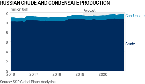 Immediately after the agreement collapsed, Russian Energy Minister Alexander Novak said that Russia could bring back 200,000 b/d to market in April, and this may increase to 500,000 b/d in the longer term. Russia’s crude and condensate output was around 11.289 mil b/d in February.