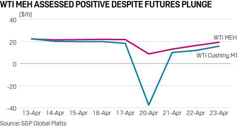 In normal times, a seller willing to offer Midland grade crude oil at the Magellan East Houston terminal might do so at a premium of a few dollars to Cushing. In fact, earlier the same day before the May contract went into free fall, there was trade reported in this MEH market at May WTI plus $7/barrel.