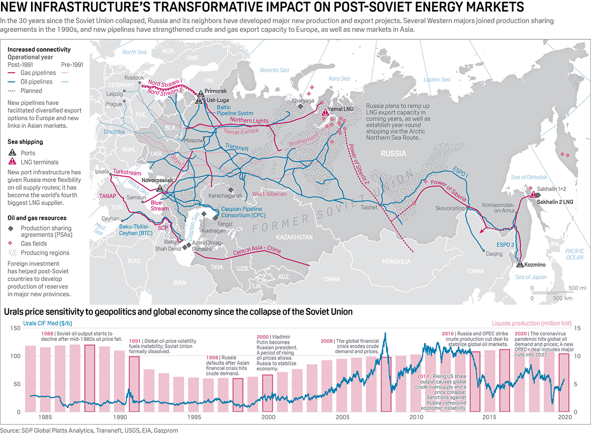 As the region marks 30 years since the collapse of the Soviet Union, these trends continue to drive political and commercial priorities. The energy transition will add an extra dimension, as producers attempt to balance plans for new hydrocarbons production and export projects with growing concerns about the environment and the increasingly evident impact of climate change.