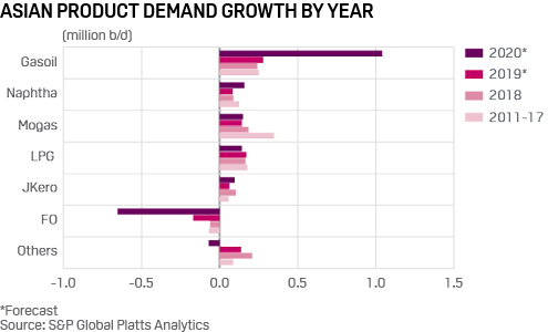 The change will also mean a significant shift in the composition of Asian oil demand, with the gasoil share rising by 2 percentage points from 2019 to 2020 and fuel oil share declining by 2 percentage points.