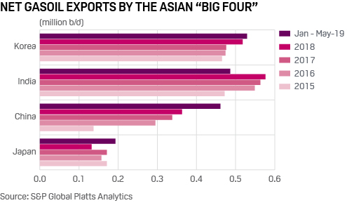 Asia’s “Big Four” (China, India, Japan and South Korea) have been exporting increasing volumes of gasoil, due to higher refinery runs as demand growth moderates.