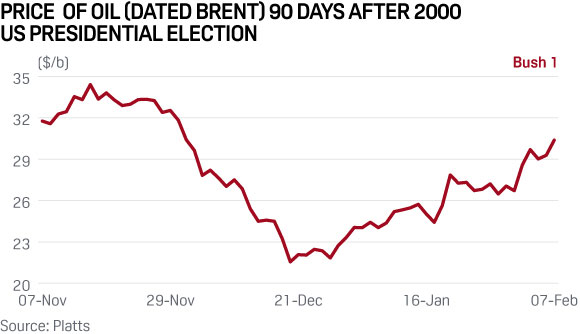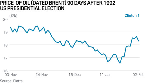 In 1992, the US elected Bill Clinton for the first time. In the days following his election, the benchmark price of oil (Dated Brent, Platts) declined from $19.46/b on November 9 to a low of $16.56/b ― losing nearly 15% ― before climbing again after his inauguration. An argument could be made that Clinton 1.0 was untested economically, leading to market uncertainty initially. Prices rallied in late January after Saudi Arabia called on OPEC to cut production by more than 1 million b/d.