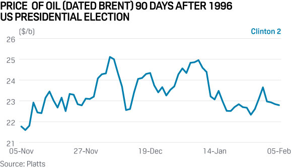 On November 5, 1996, the US re-elected Bill Clinton to a second term. Contrary to 1992, the benchmark price of oil (Dated Brent, Platts) gained immediately the month after the election from $21.77/b to $25.11/b on December 5 ― firming 15.3% before dropping to $22.56/b, followed by some strengthening. Largely range-bound, the price averaged $23.37/b in the 90 days after Election Day.