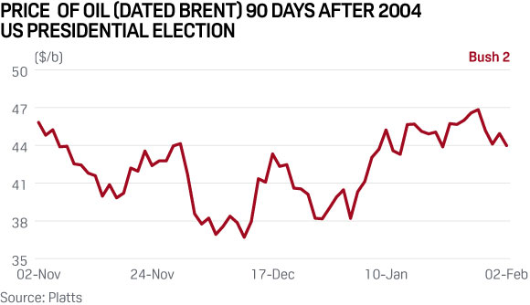 Bush’s re-election to a second term saw the benchmark price of oil (Dated Brent, Platts) immediately dip from the mid-$40s/b to high-$30s, followed by an upswing, a couple of falls and then further strengthening after January. Less volatility was evident than post-November 2000, and the price averaged $42.14/b in the 90 days after Bush was elected to another term. The return of US Gulf Coast crude following Hurricane Ivan pulled prices lower in November, while a December 10 OPEC decision to cut crude, followed by expectations of further cuts, rallied prices early in 2005.