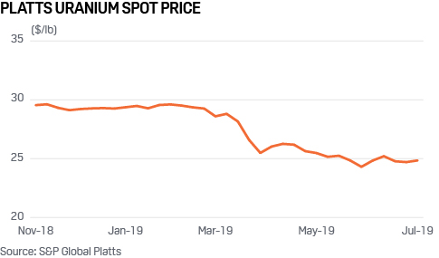 S&P Global Platts assessed the spot price of uranium at $24.84/lb July 3, based on the mean of assessed activity for U308 delivered over the next 12 months.