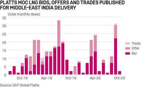 Platts has observed 5.59 million mt of tenders for spot deliveries issued for India, Dubai and Kuwait delivery for cargoes delivering between January-October 2020. This compares with 11.15 million mt of LNG tenders for JKTC delivery over the same period.