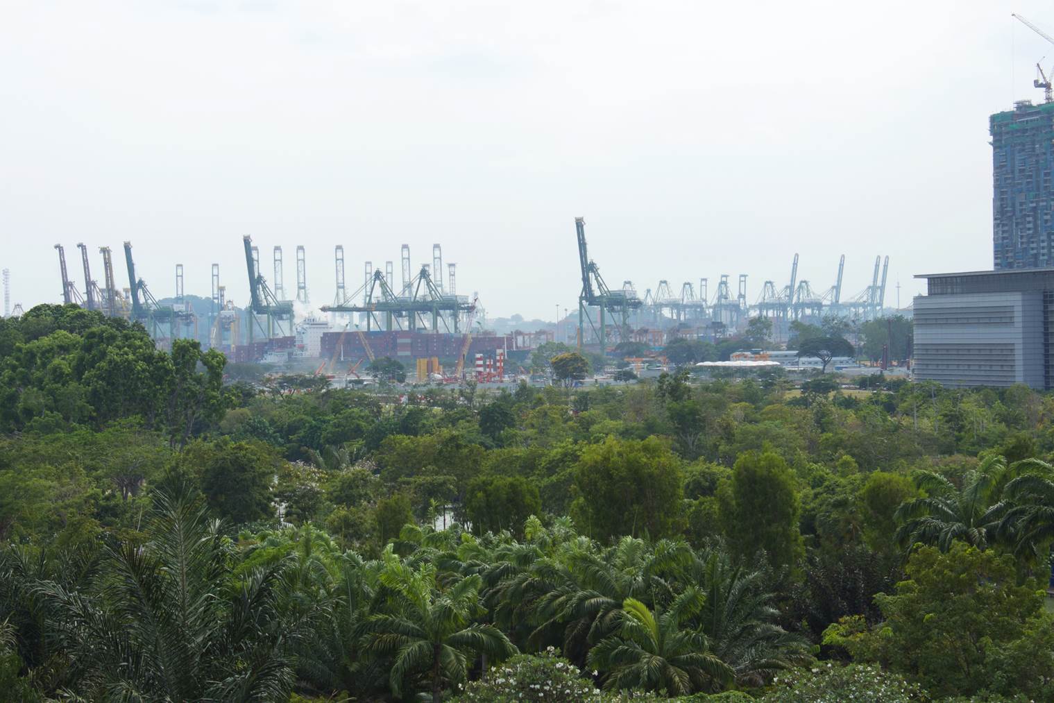 When driving in from Changi airport at night, the first indicator was the large number of container gantry cranes with their booms up, rather than down and working cargo.
