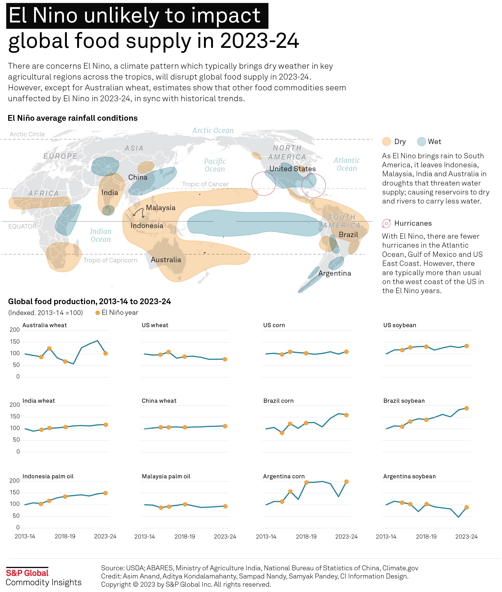 There are concerns El Nino, a climate pattern which typically brings dry weather in key agricultural regions across the tropics, will disrupt global food supply in 2023-24. However, except for Australian wheat, estimates showed that other food commodities seem unaffected by El Nino in 2023-24, in sync with historical trends.