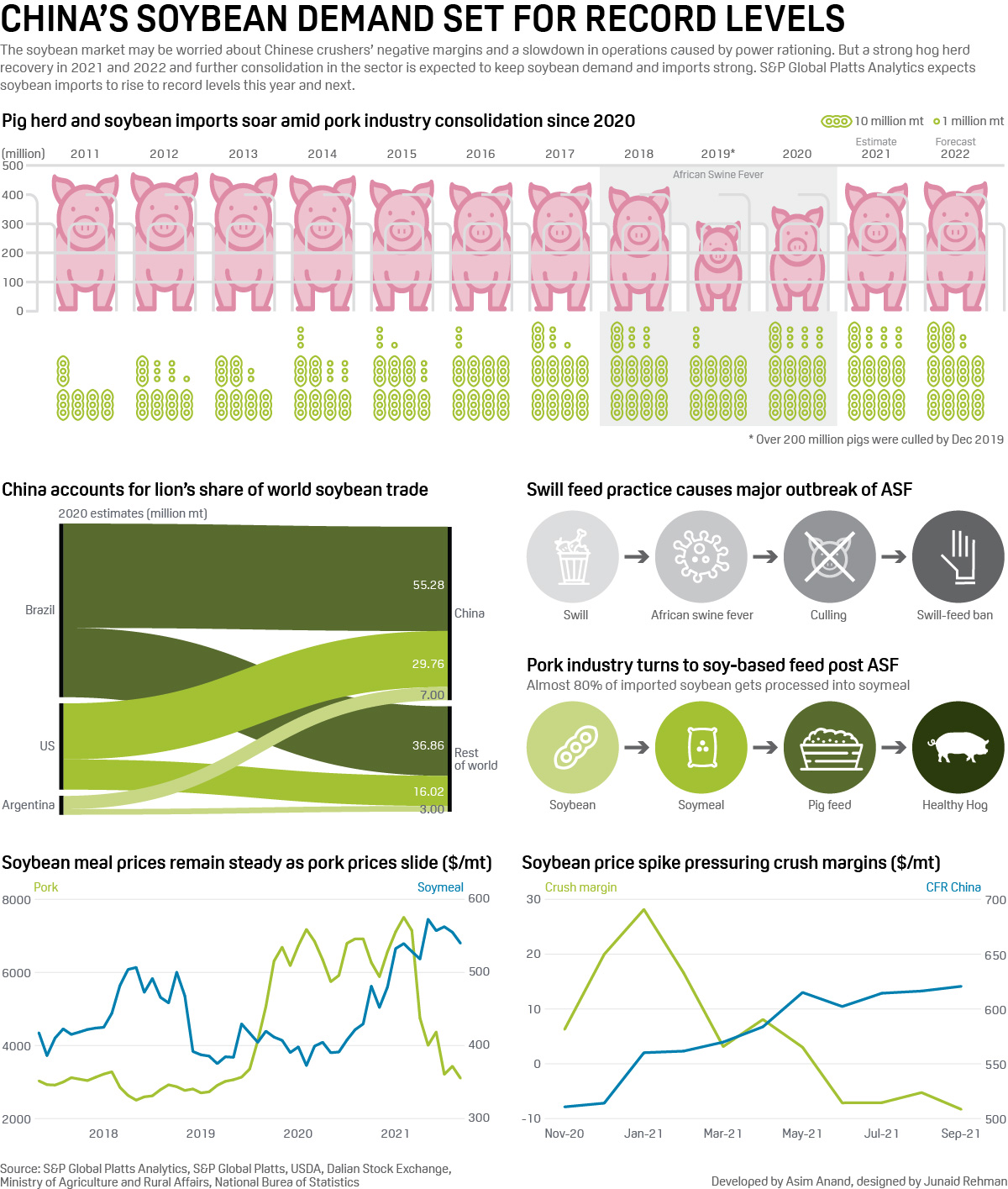 The soybean market may be worried about Chinese crushers' negative margins and a slowdown in operations caused by power rationing. But a strong hog herd recovery in 2021 and 2022 and further consolidation in the sector is expected to keep soybean demand and imports strong. S&P Global Platts Analytics expects soybean imports to rise to record levels this year and next.
