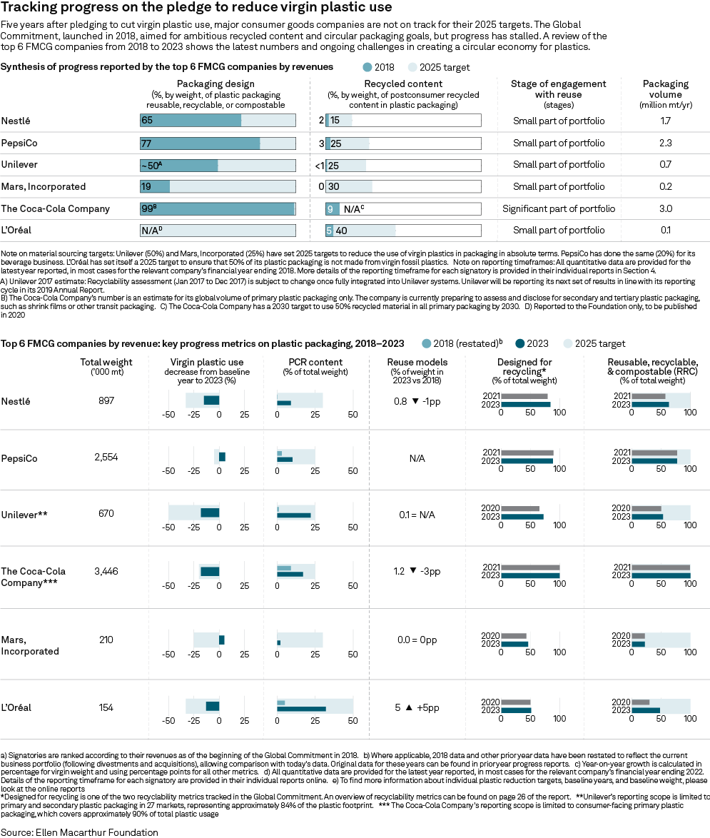 The Global Commitment brings together over 250 businesses to achieve aligned 2025 targets for plastic packaging. It emphasizes increasing post-consumer recycled content, with individualized company targets with the weighted average being 26% by 2025, reducing virgin plastic usage, and eliminating unnecessary plastic packaging.