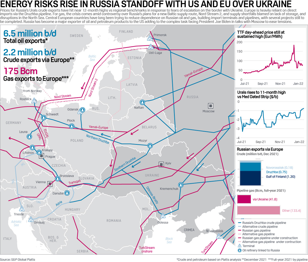 Prices for Russia's Urals crude exports have hit near 12-month highs vs regional benchmarks in response to fears of escalation on the border with Ukraine. Europe is heavily reliant on direct imports via the Druzhba pipeline. For gas, the crisis comes amid controversy over Russia's plans for a new Baltic supply route, Nord Stream 2, and supply shortfalls blamed on lack of storage, and disruptions in the North Sea.