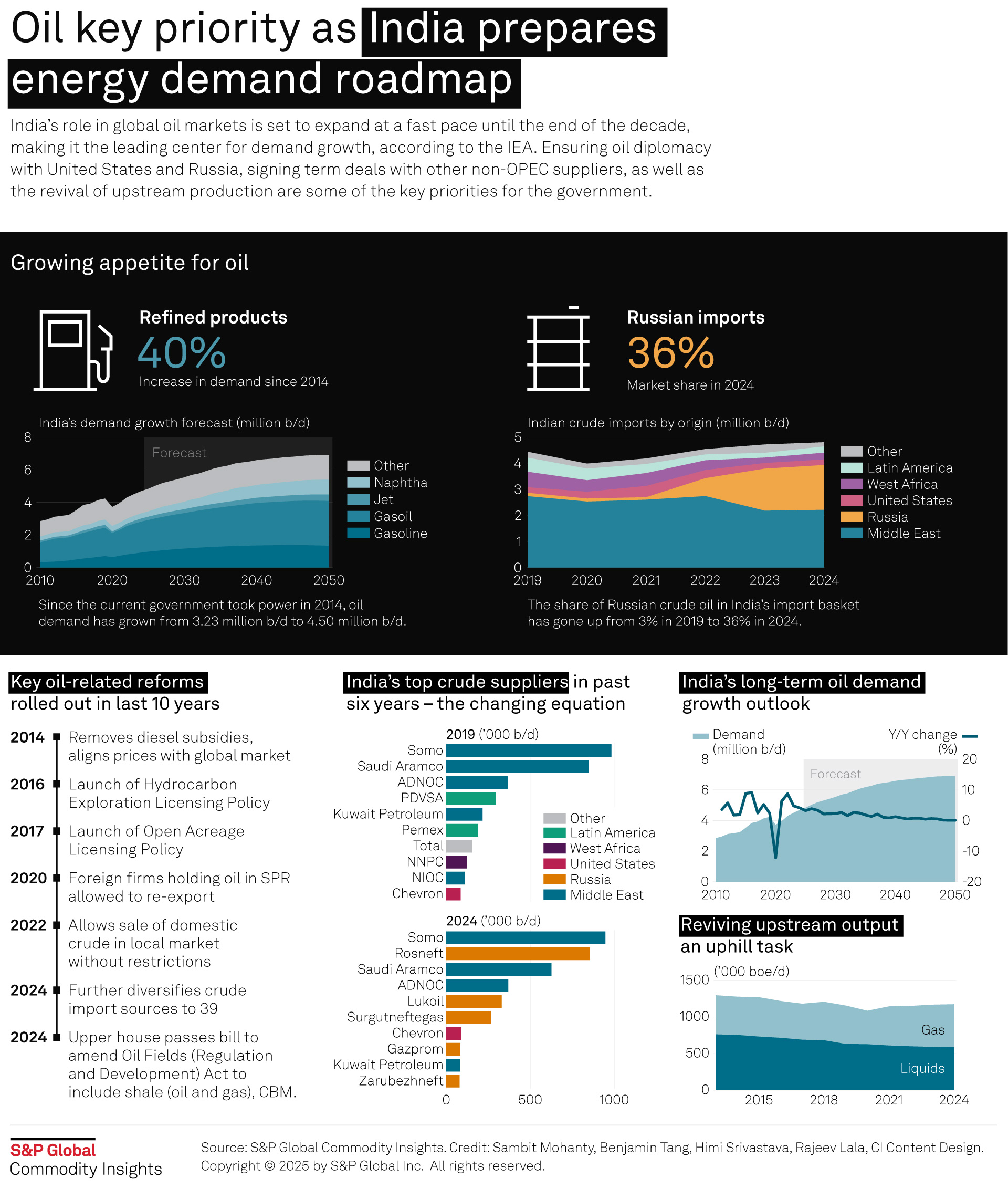 Asia's second-biggest economy is projected to achieve a relatively faster growth rate in oil demand of 3.2%, compared to China's 1.7%, according to S&P Global Energy. Key government priorities include fostering oil diplomacy with the US and Russia, signing term deals with non-OPEC and new crude oil suppliers, pursuing refining expansion, and making the upstream sector more attractive to overseas investors.