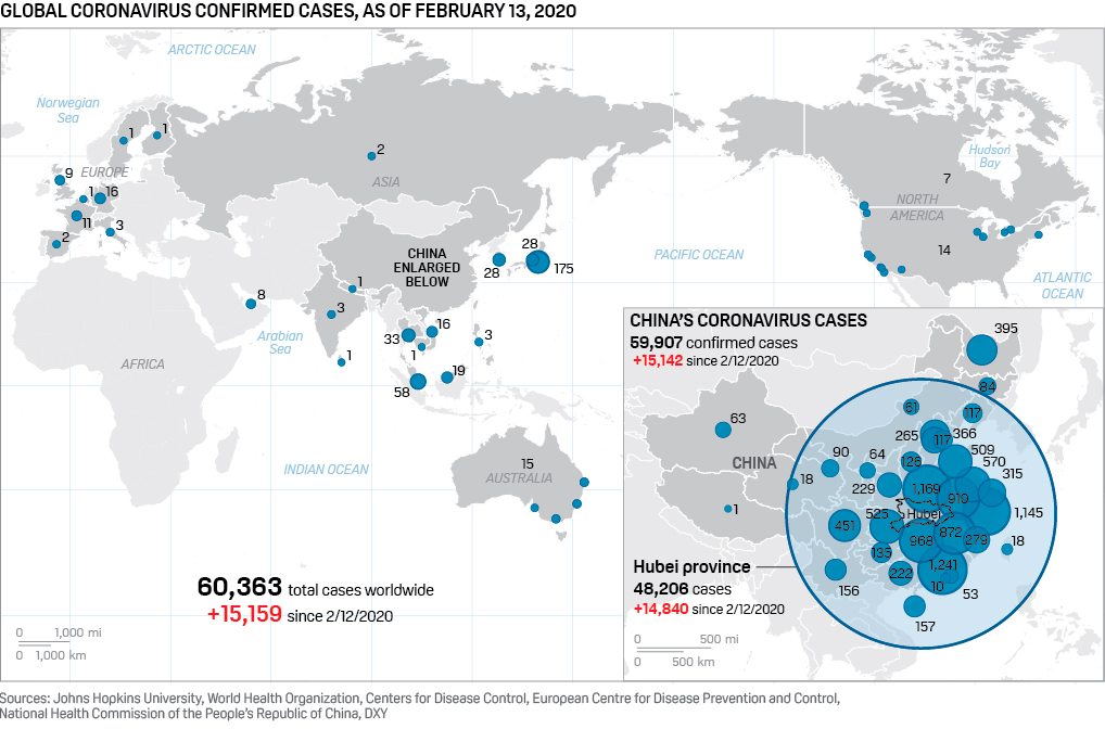 Futures came under pressure overnight amid reports of a sharp uptick in coronavirus cases and deaths in China. Globally, the number of confirmed cases has risen to 60,364, with 59,826 of those in China, according to the Johns Hopkins University.