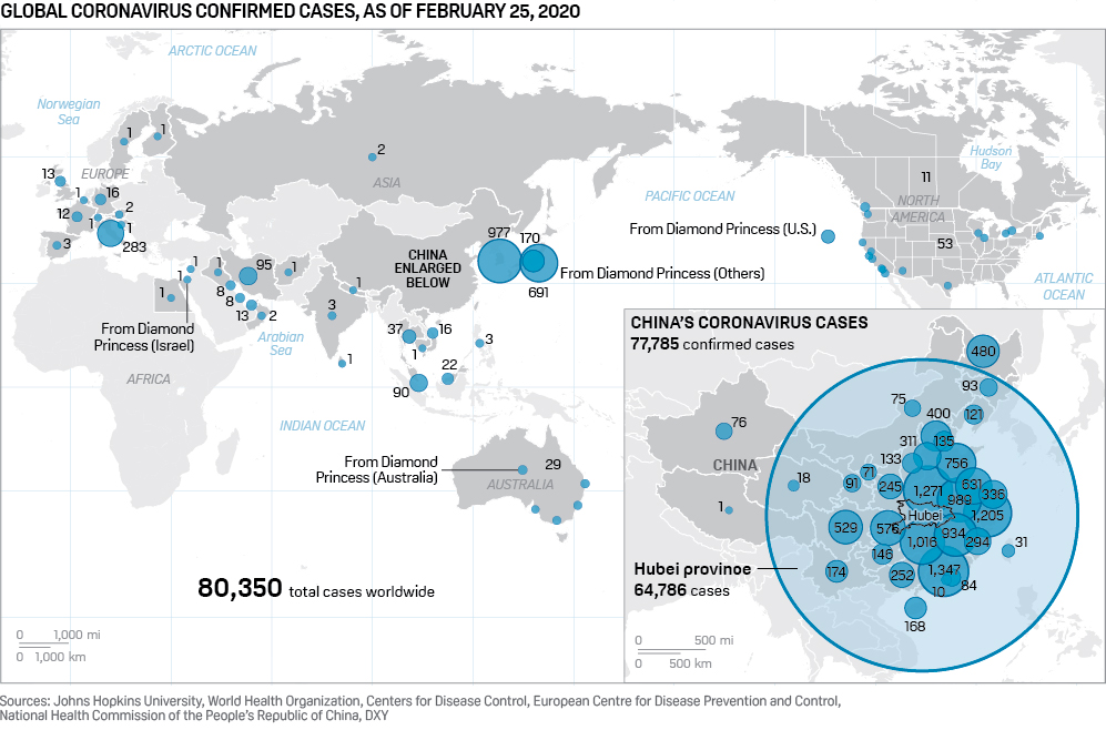 Mainland China accounts for just under 97% of confirmed cases worldwide, but South Korea and Italy have emerged as major growth centers for new cases this week.
