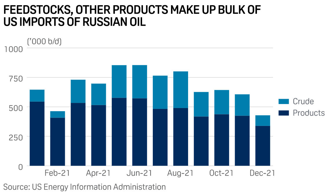 The US imported 473,000 b/d of Russian refined products and 199,000 b/d of Russian crude in 2021, according to the Energy Information Administration.