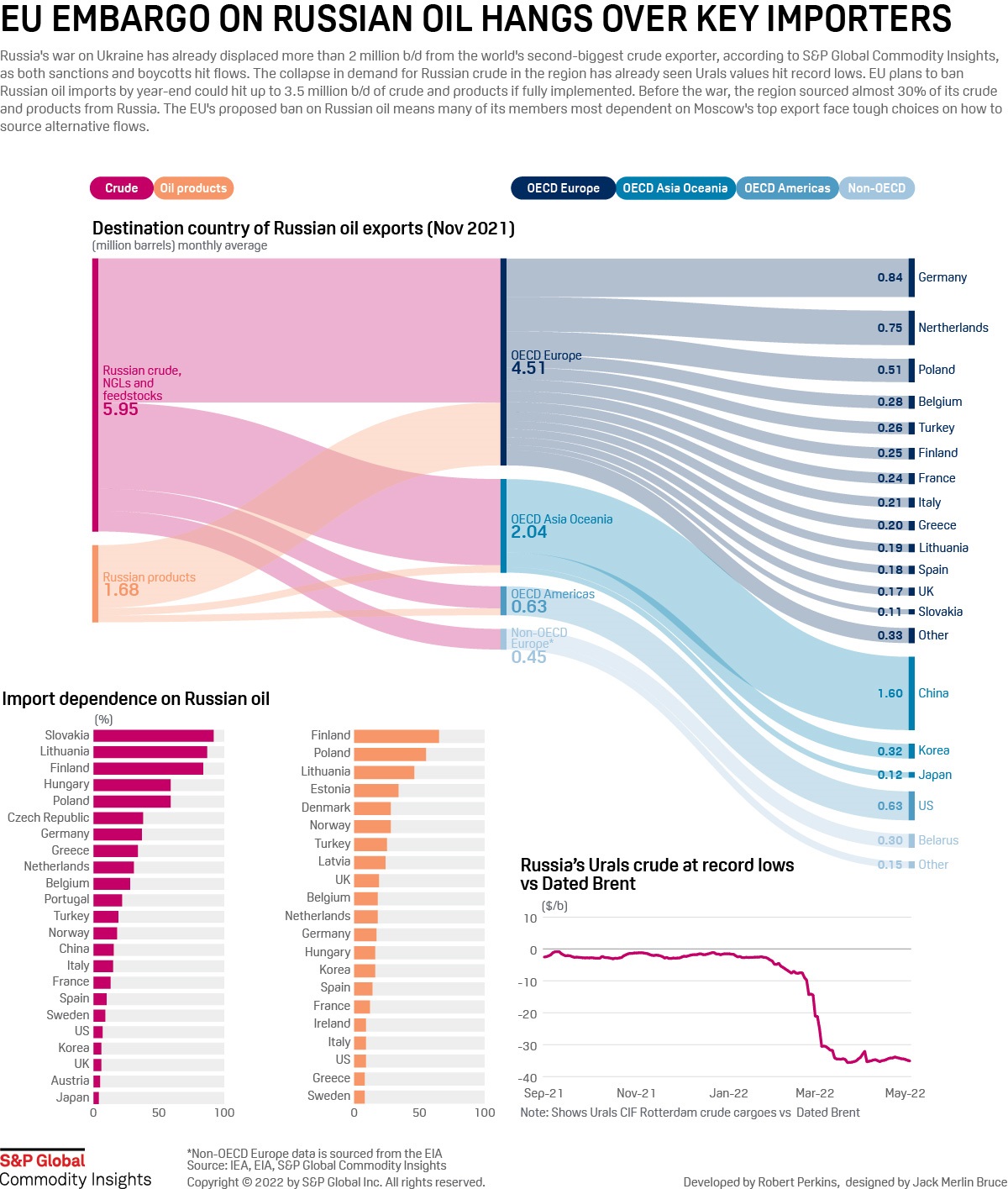 Before the war, the region sourced almost 30% of its crude and products from Russia. The EU's proposed ban on Russian oil means many of its members most dependent on Moscow's top export face tough choices on how to source alternative flows.
