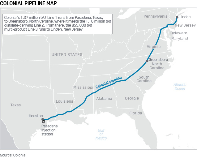 Colonial ships 1.5 million b/d of gasoline on its Line 1 pipeline and 1.16 million b/d of distillates on its Line 2 pipeline, with both lines ending in Greensboro, North Carolina.