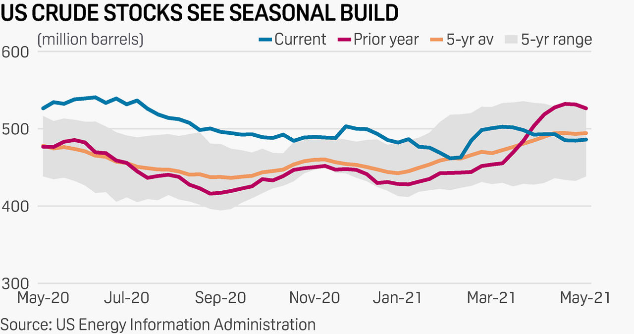 Despite the stronger refinery demand, total US crude stocks climbed 1.32 million barrels to 486.01 million barrels as imports surged 920,000 b/d to a three-week high 6.41 million b/d. Crude inventories climbed in all regions outside of the US West Coast, where stocks fell 2.45 million barrels to 45.79 million barrels - the lowest since the week ended Dec. 18, 2020.