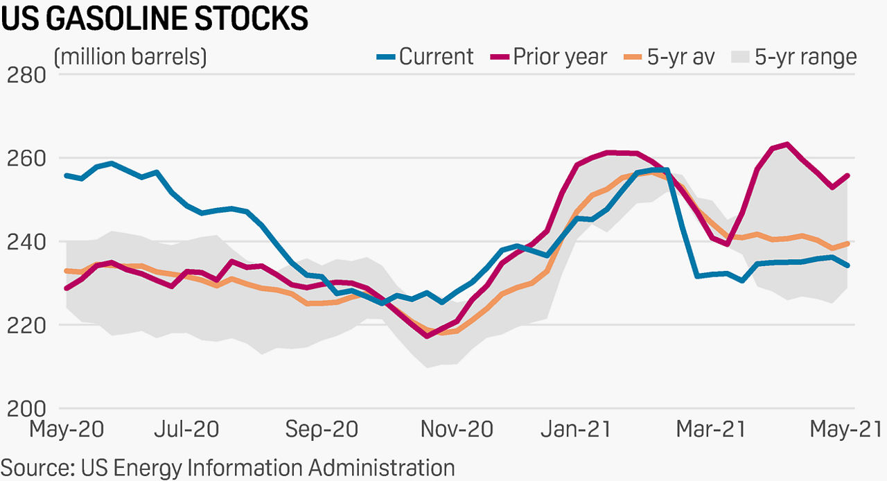 USAC gasoline stocks fell 4.58 million barrels to 60.02 million barrels, leaving them at the lowest since the week ended Oct. 9, 2020, and nearly 11% behind the five-year average for this time of year.