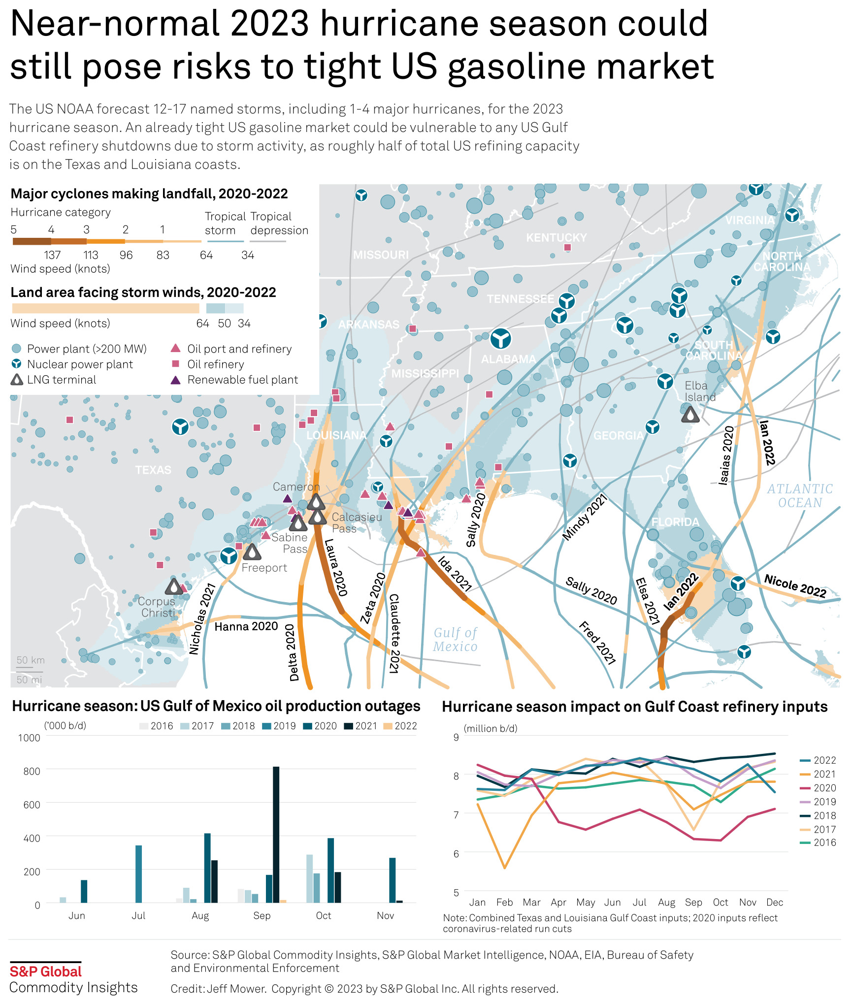 Hurricane season is on its way in the Atlantic region. The National Oceanic and Atmospheric Administration forecast near-normal numbers for tropical activity in the 2023 Atlantic hurricane season. But even near-normal numbers could tighten the US gasoline market, and disrupt oil production and trade flows.