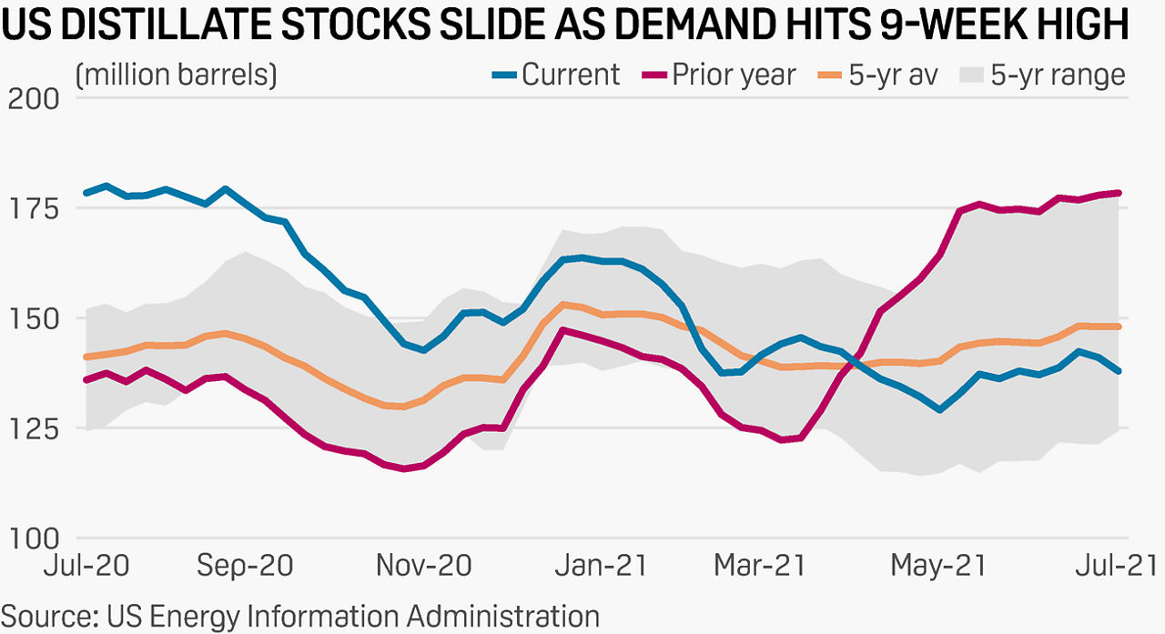 Total US distillate stocks fell 3.09 million barrels to 137.91 million barrels last week, EIA said, a four-week low and nearly 23% behind the five-year average.