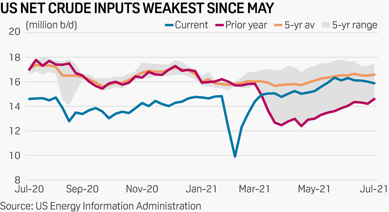 Total US crude production was down 200,000 b/d at 11.2 million b/d, a four-week low, but this decline was largely offset by a 130,000 b/d slide in total refinery net crude inputs, which were the weakest since May at 15.88 million b/d.
