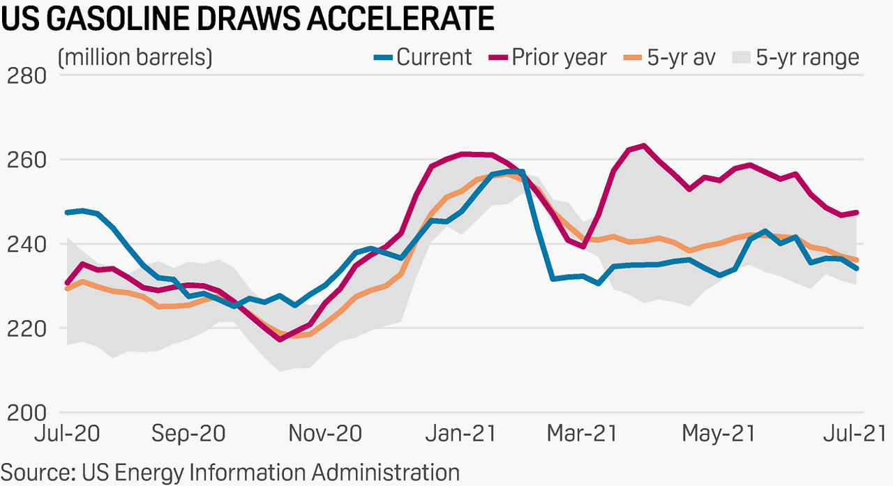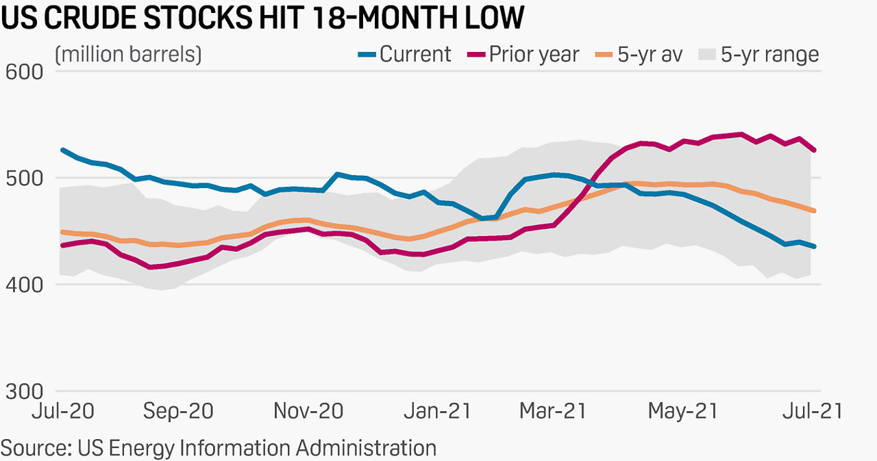 American Petroleum Institute data released after market settle July 27 showed US crude oil stocks fell 4.73 million barrels during the week ended July 23, while analysts surveyed by S&P Global Platts on July 26 had called for a 2.5 million-barrel draw over the same period.