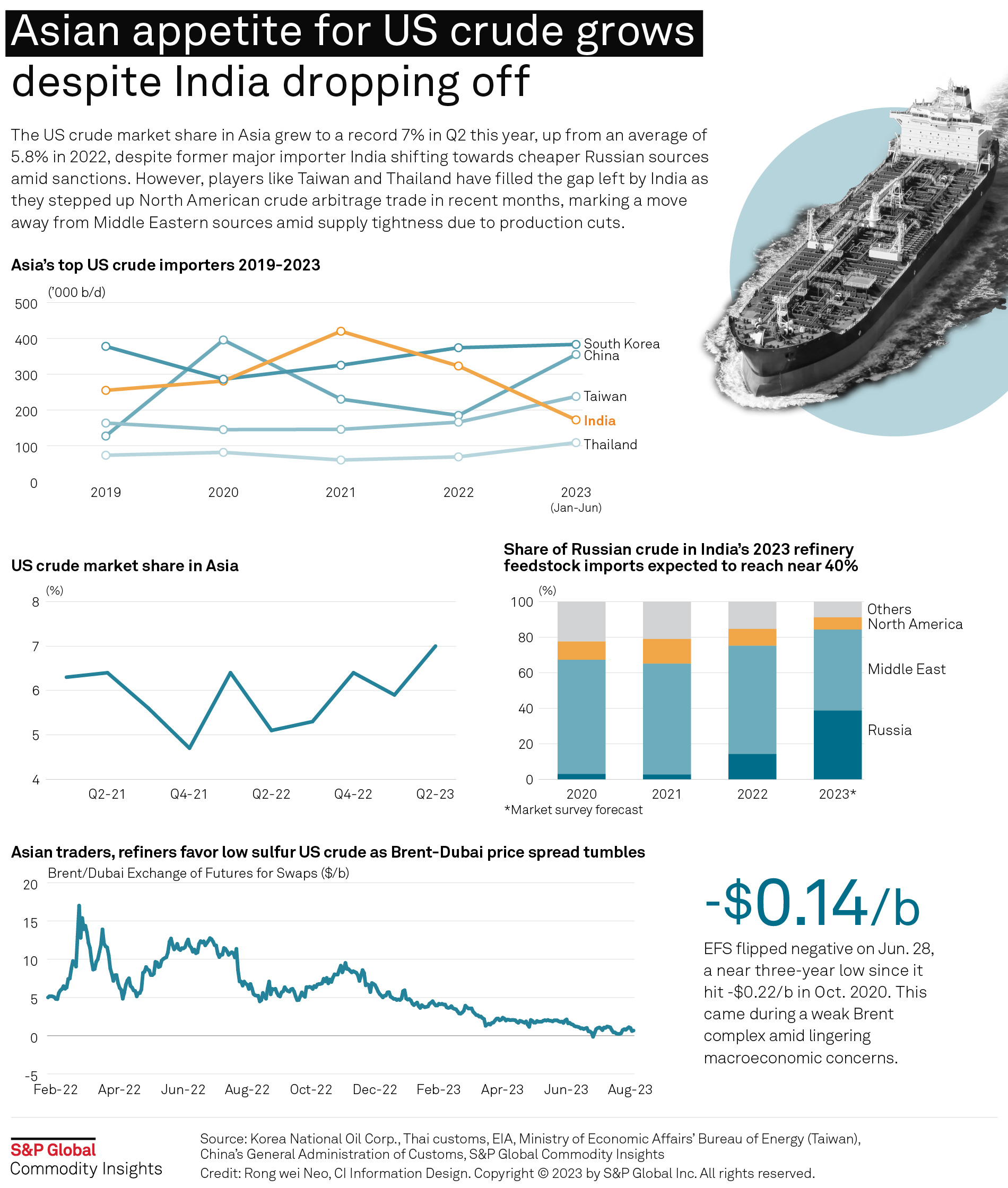 The US crude market share in Asia grew to a record 7% in Q2 this year, up from an average of 5.8% in 2022, despite former major importer India shifting towards cheaper Russian sources amid sanctions. However, players like Taiwan and Thailand have filled the gap left by India as they stepped up North American crude arbitrage trade in recent months, marking a move away from Middle Eastern sources amid supply tightness due to production cuts.