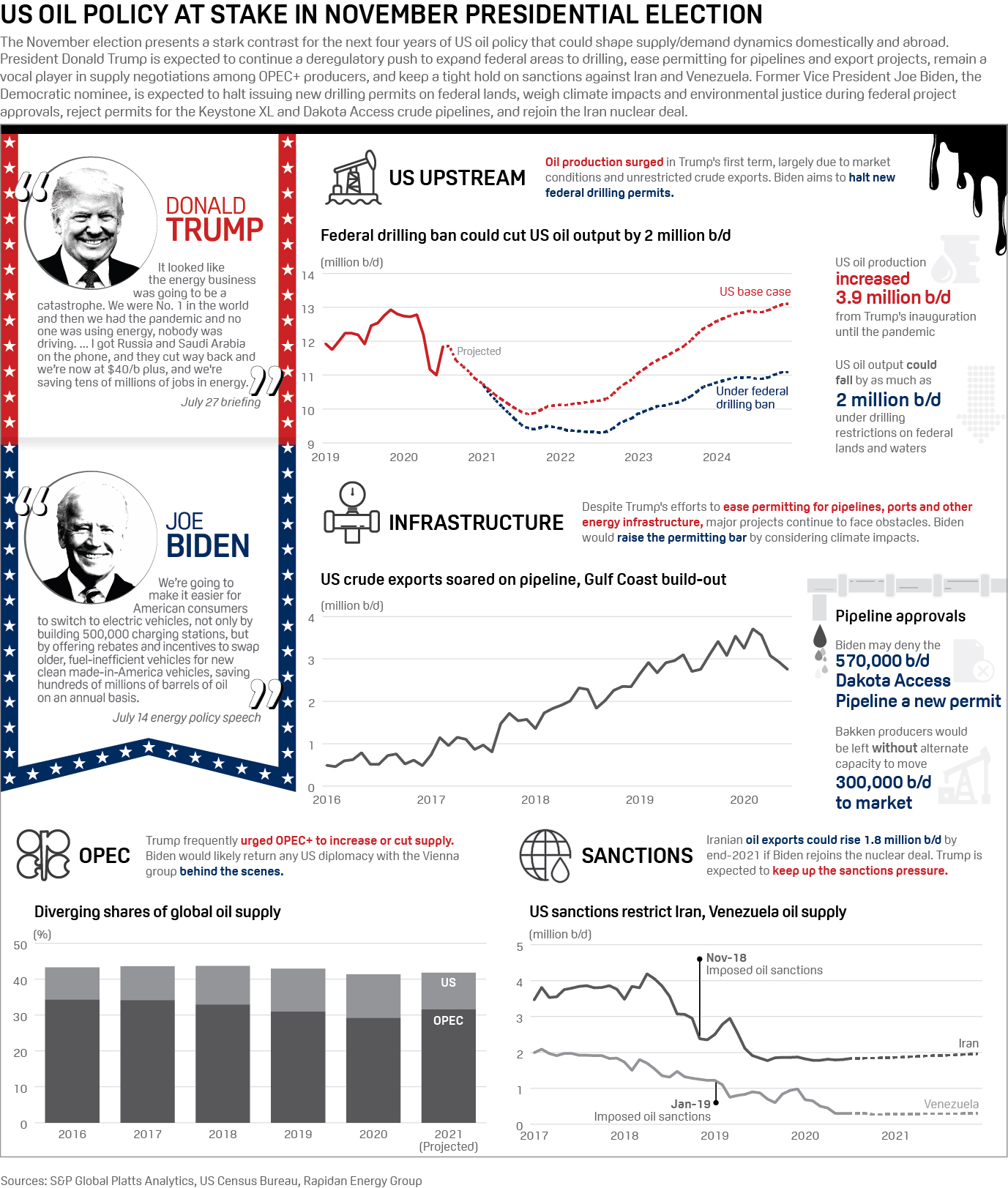 The US presidential election in November presents a stark contrast for the next four years of US oil policy that could shape supply/demand dynamics domestically and abroad, with implications for shale, sanctions, trade and OPEC relations.