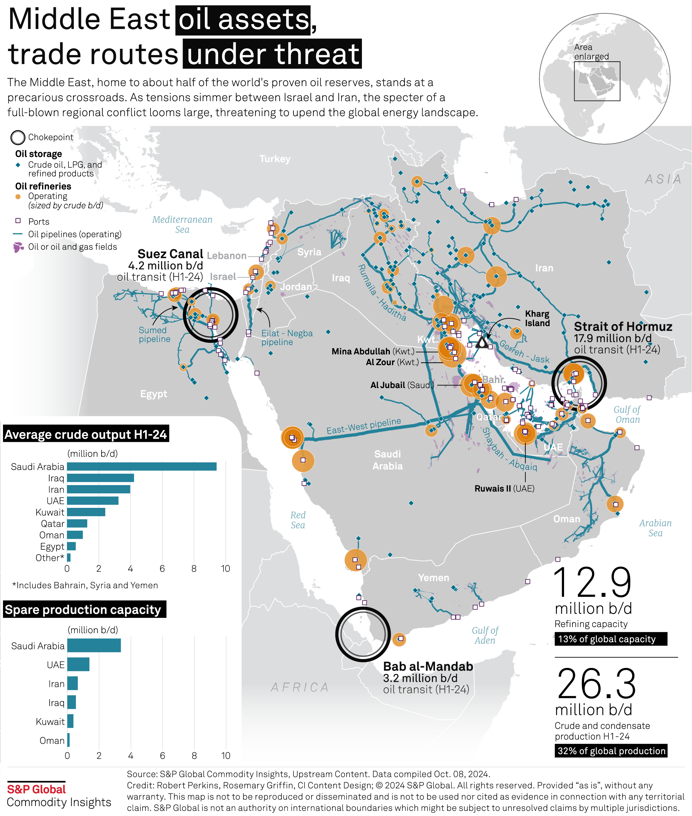 Most of Iran's crude flows head to buyers in Singapore and China, where the bulk of any supply disruption would be felt If Iran's oil facilities are attacked. But Iran has threatened wider oil markets in the past by attacking shipping and laying mines in the Strait of Hormuz, through which almost 18 million b/d of crude and products transited during the first half of 2024. Analysts see any major shutdown of oil flows through the chokepoint as unlikely.
