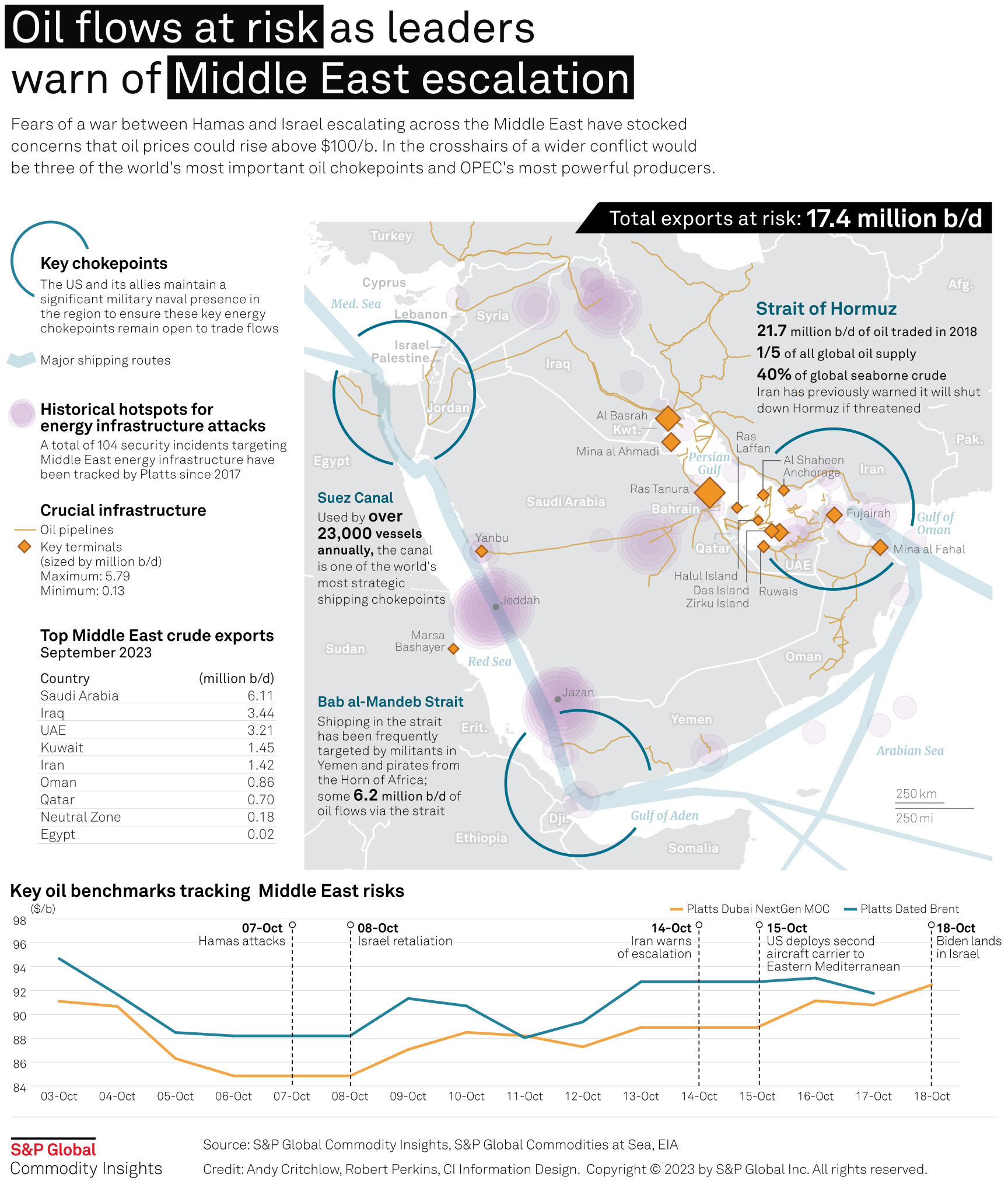 With war ongoing between Israel and militant group Hamas, oil markets are on edge after Iran warned the conflict could escalate across the Middle East. The region's energy infrastructure and key shipping chokepoints are at risk should the conflict spread, which could send oil prices soaring and dramatically impact supply.