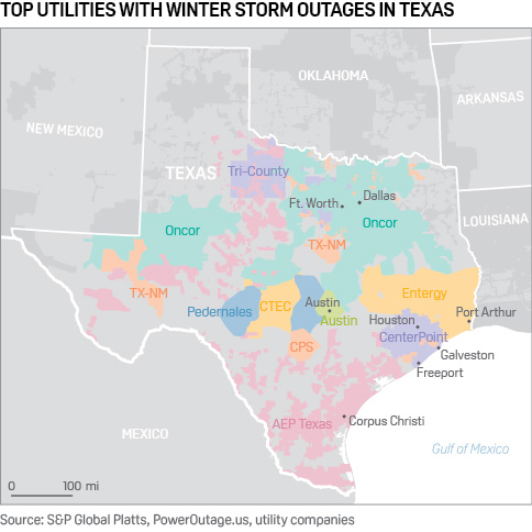 Austin, Texas — Texas had about 2.8 million electric utility customers without power due to the winter storm shutting down generation capacity around 4 pm CT Feb. 17, and real-time wholesale prices reflected that scarcity, as utilities and the grid operator struggled to restore and maintain service to customers.