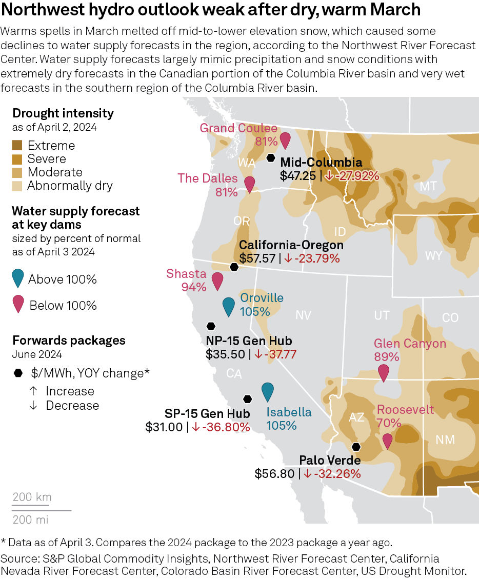 Mid-C on-peak June is in the mid-$40s/MWh, down nearly 28% from where its 2023 counterpart was a year ago, although prices climbed about $5 from February, according to data from Platts, part of S&P Global Commodity Insights. Likewise, the Sumas June contract is around $1.573/MMBtu, 22.7% below its 2023 counterpart.