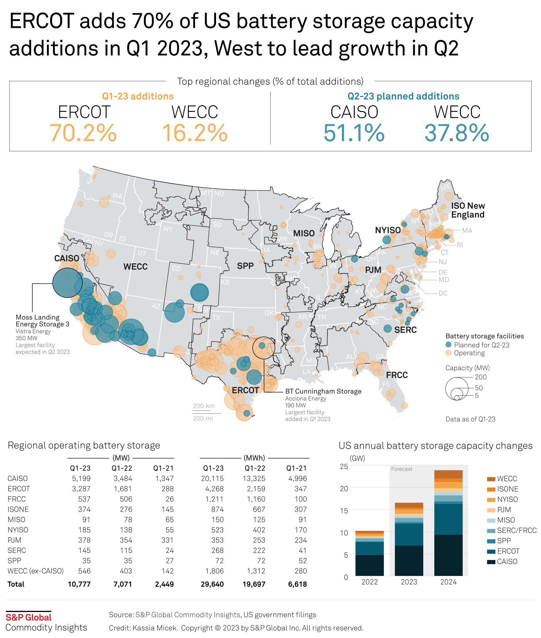 There was 710 MW of capacity added during Q1, an increase of 7% from the end of 2022, according to an S&P Global Commodity Insights compilation of various government filings. The data includes facilities that either began commercial operation or were synchronized to the grid.