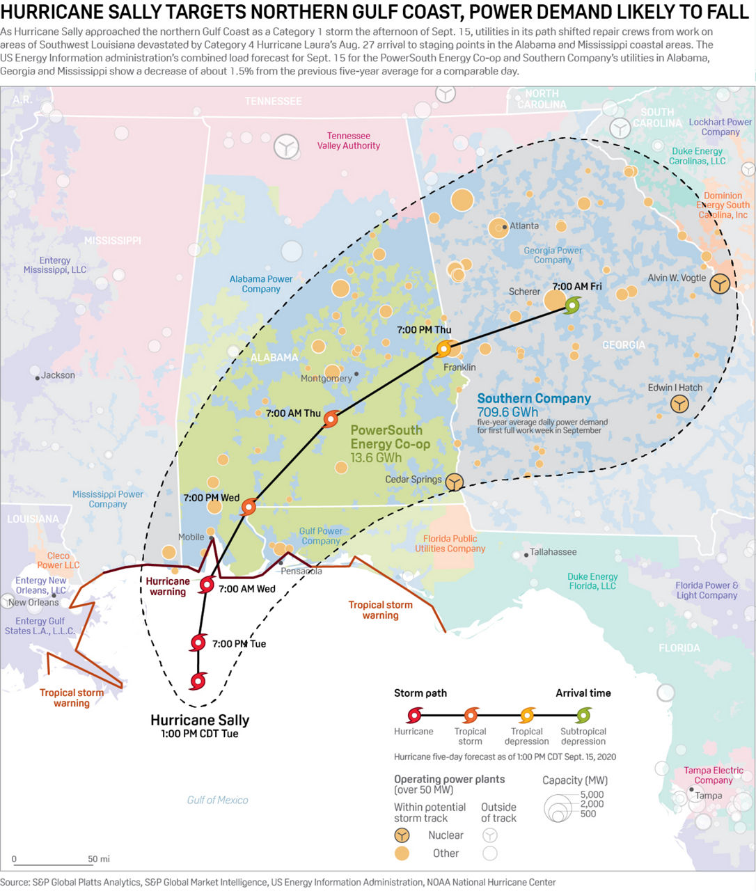 Houston — As Hurricane Sally slowly approached the northern US Gulf Coast Sept. 15, utilities in its path shifted resources from helping restore power in southwest Louisiana following the devastation caused by Hurricane Laura to staging points near the Alabama and Mississippi coastlines.