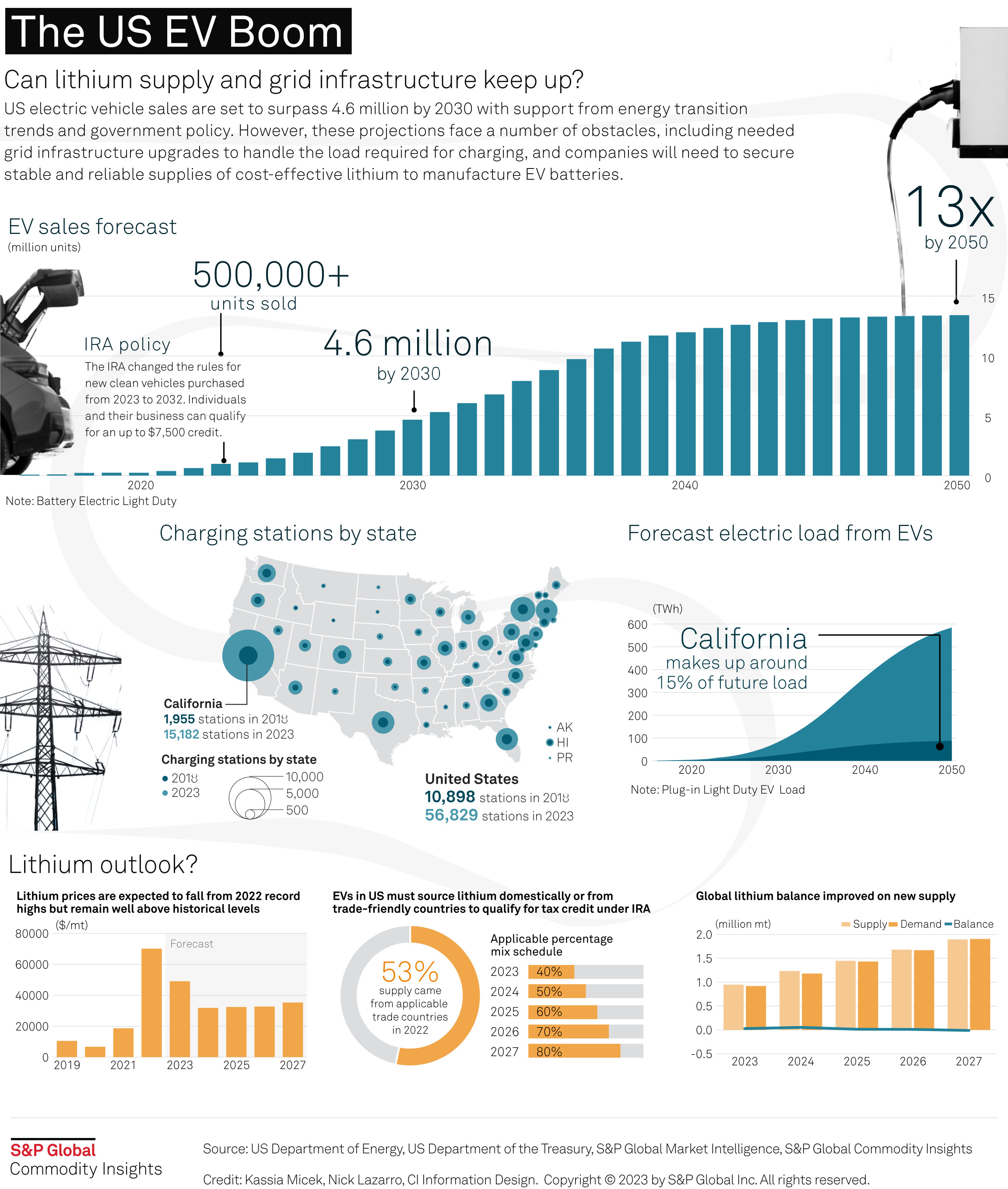 US electric vehicle sales are set to surpass 4.6 million units by 2030 with support from energy transition trends and government policy. However, these projections face a number of obstacles. Among them, the US will need to upgrade its grid infrastructure to handle the load required for charging, and companies will need to secure stable and reliable supplies of cost-effective lithium to manufacture EV batteries.