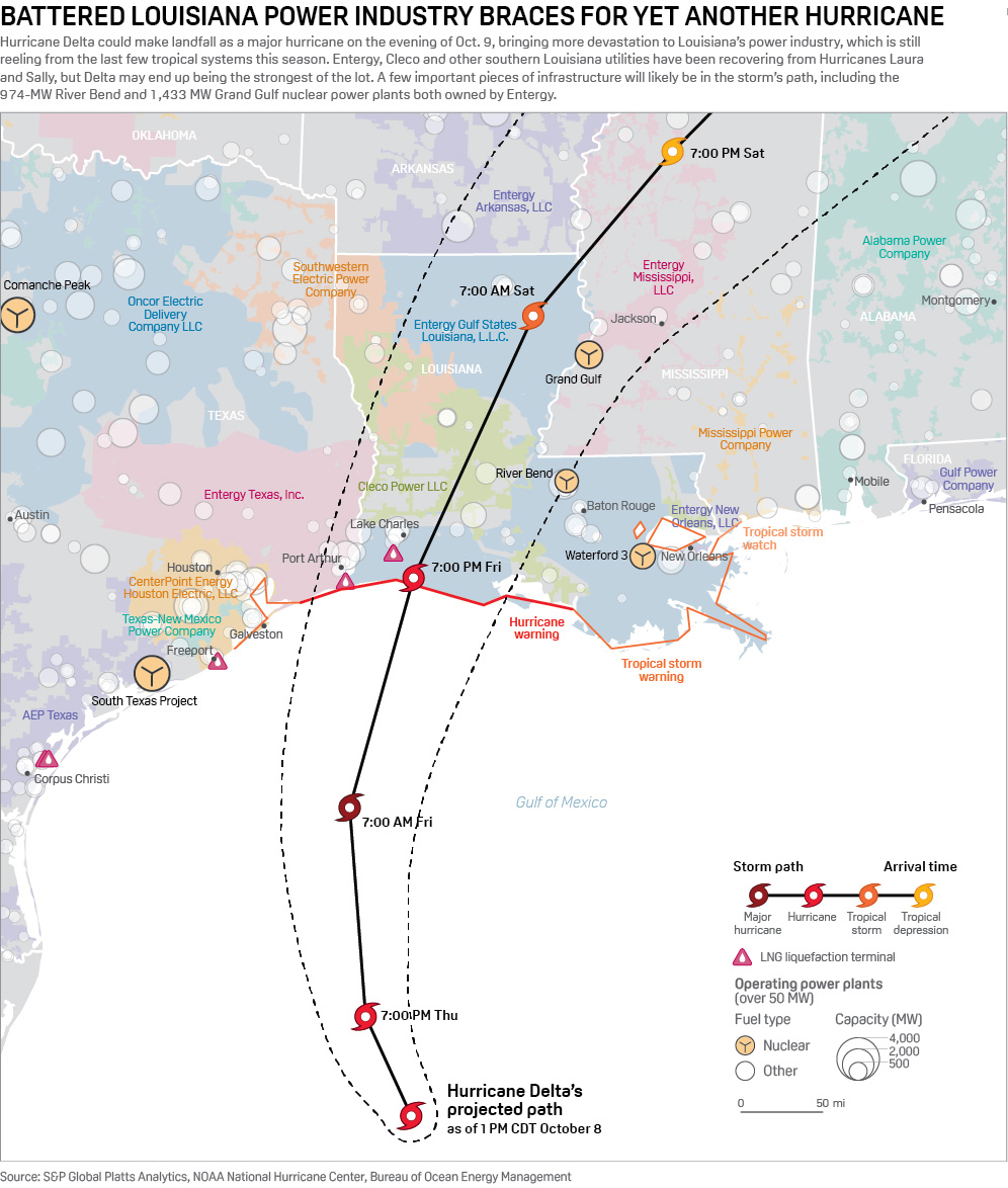 Entergy, Cleco and other southern Louisiana utilities have been recovering from Hurricanes Laura and Sally, but Delta may end up being the strongest of the lot. A few important pieces of infrastructure will likely be in the storm's path, including the 974-MW River Bend and 1,433 MW Grand Gulf nuclear power plants both owned by Entergy.