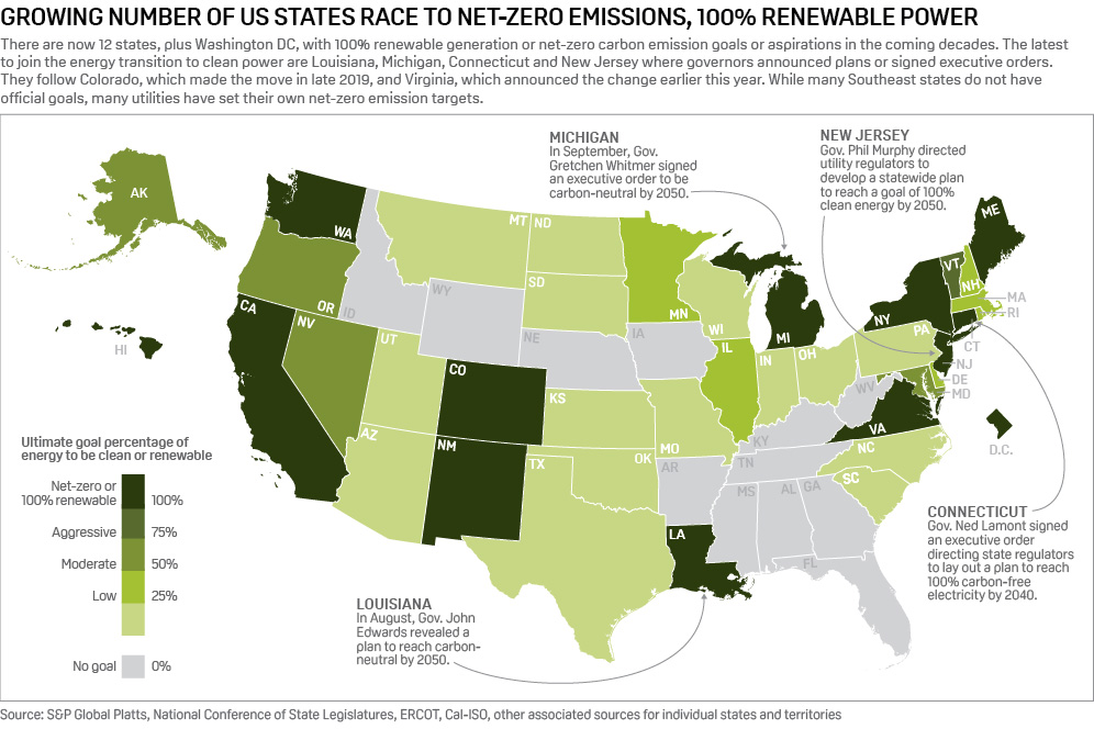 Four more governors announced plans to put their states on a path toward 100% renewables or carbon-free emissions, bringing the total up to 12 states that are leading the US energy transition, while the recent stimulus package could be a major driver for renewable energy penetration.