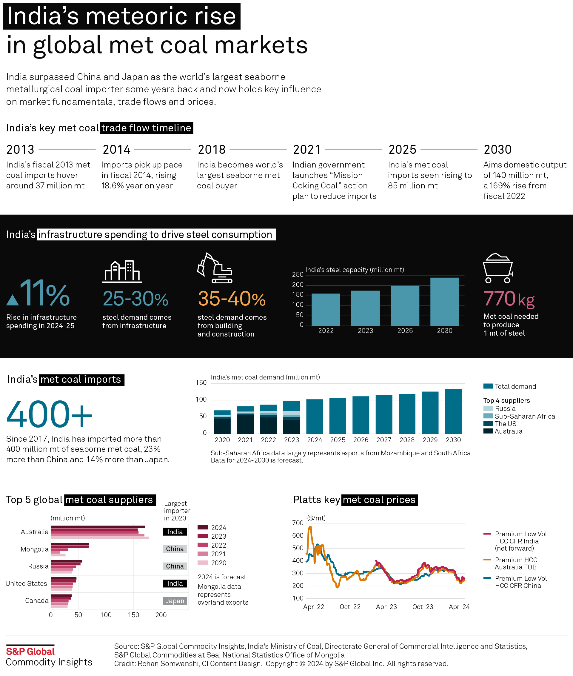 This is expected to further fuel India’s coking coal requirements. India also aims to boost domestic coking production and reduce imports. Despite this plan, India’s coking coal imports are set to reach 100 million mt in 2030, S&P Global Commodity Insights estimates.