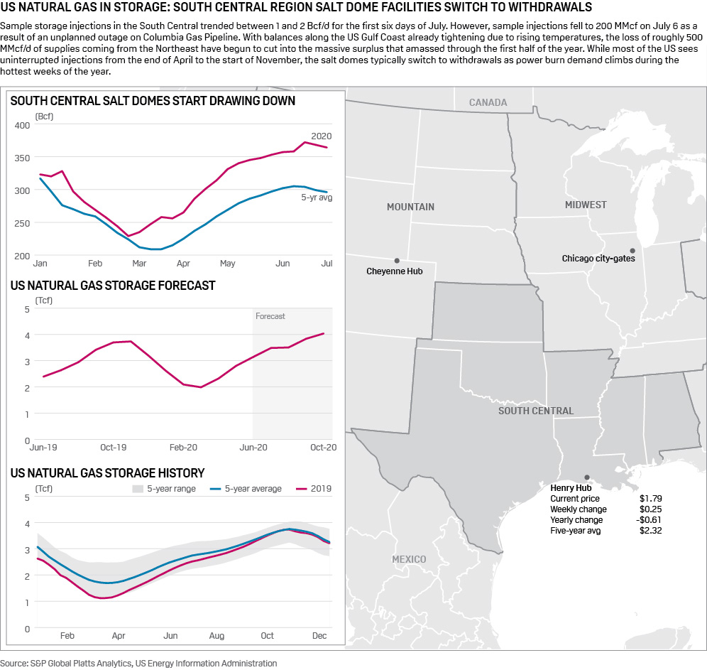 Platts Analytics' supply and demand model currently expects a 52 Bcf injection for the week ending July 10, which would be 11 Bcf below the five-year average, as supply-and-demand fundamentals draw tighter.