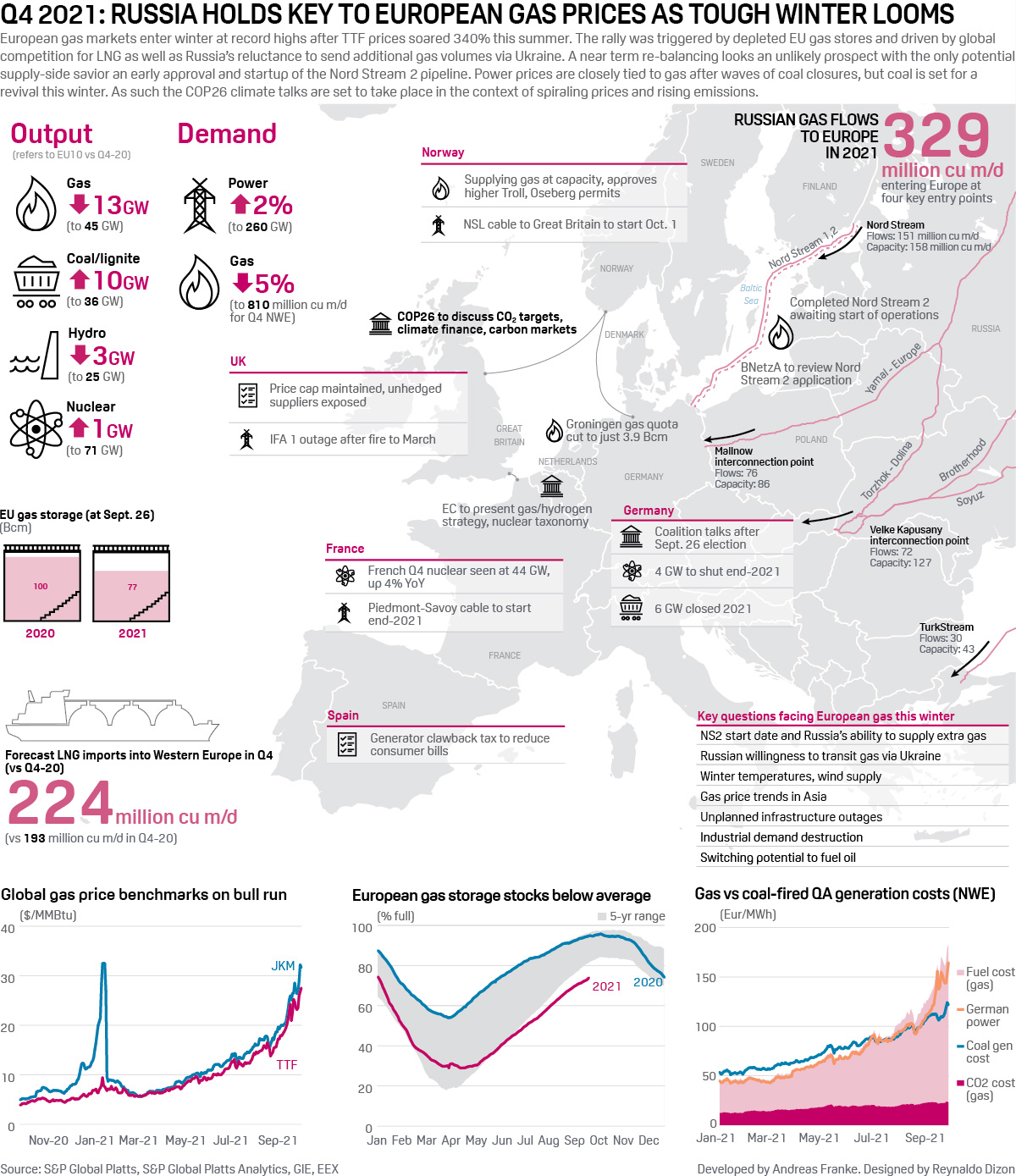 European gas markets enter winter at record highs after TTF prices soared 340% this summer. The rally was triggered by depleted EU gas stores and driven by global competition for LNG as well as Russia's reluctance to send additional gas volumes via Ukraine.