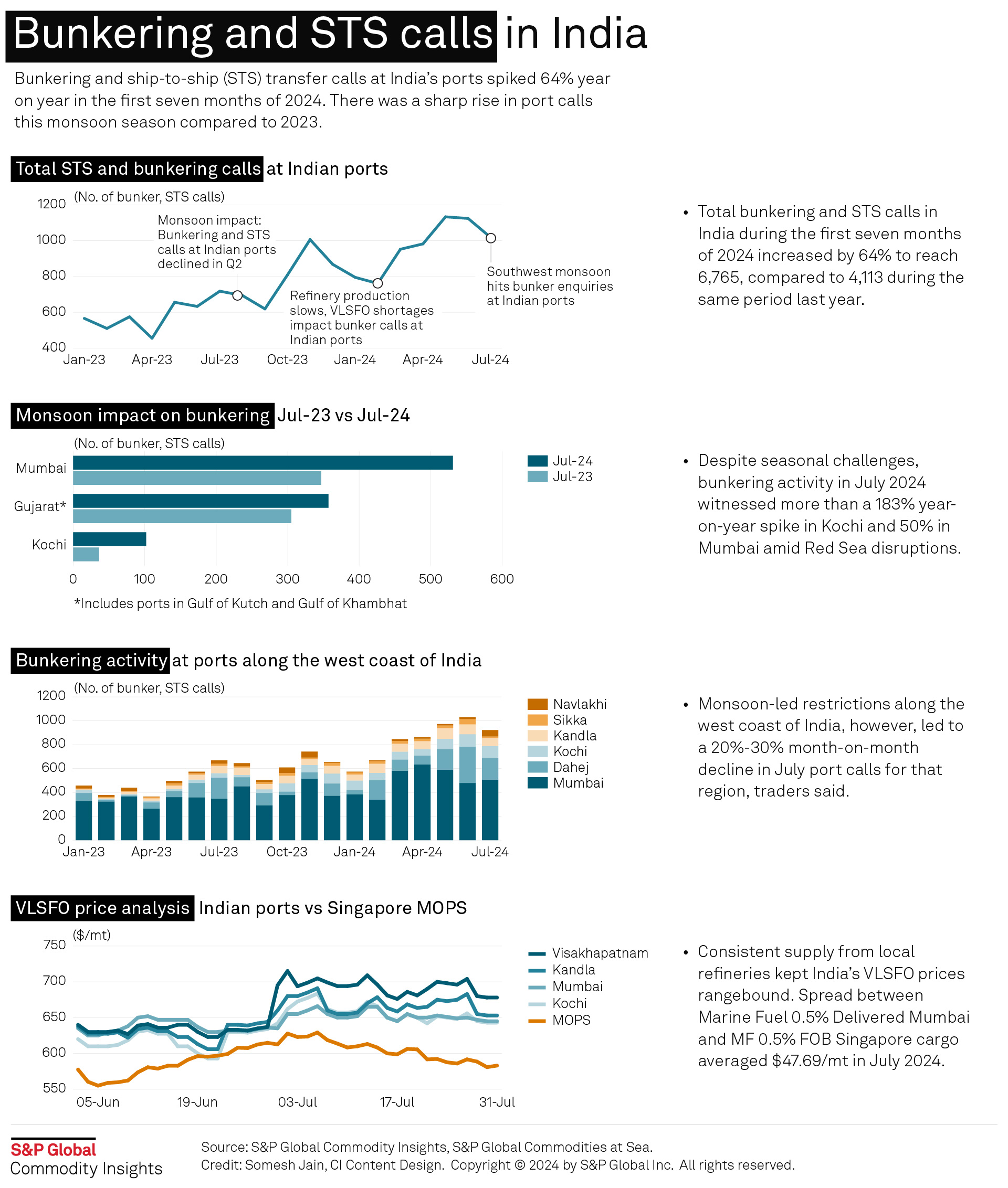 Attacks on shipping in the Red Sea have prompted shipowners to take longer voyages around Africa. This disruption caused a substantial increase in monsoon bunker demand at Indian ports, which is typically lower due to weather disruptions. The growth was further fueled by favorable pricing and consistent supply flows from domestic refineries since second quarter of 2024.